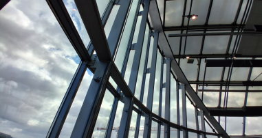 Heute bei der Begutachtung von Delaminationserscheinungen an Verbundsicherheitsgläsern im Bereich der Punkthalter. Die punktgehaltene Glasfassade und die noch Original-Glasscheiben stammen aus den 1990er Jahren.