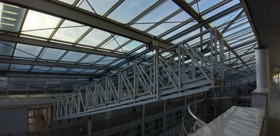 Heute bei der gutachterlichen Bewertung der Betretbarkeit und der Zustandsprüfung einer Glasdachkonstruktion aus 1990er Jahren in Düsseldorf. Aufgrund der fehlenden Bestandsunterlagen soll u.a. festgestellt werden, ob die Glasscheiben zu Reinigungs- und Wartungszwecken betreten werden können.