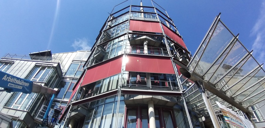 Nach der erfolgreichen Probeinstandsetzung wurde heute mit der Instandsetzung der durch Deckenduchbiegungen verfomten Pfostenprofile der elementierten Pfosten-Riegel-Konstruktion einer ca. 6000 m² großen Glasfassade begonnen, um die zwängungsfreie Lagerung der Glasfassade trotz der weiterhin bestehenden Deckendurchbiegungen dauerhaft wiederherzustellen.